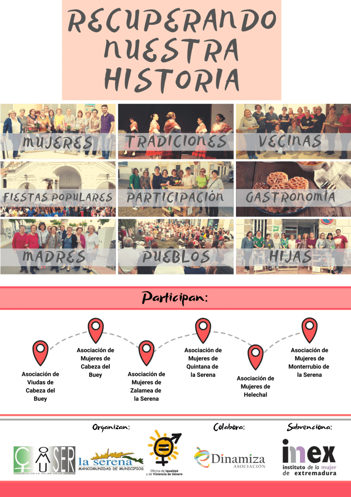 Recuperando Nuestra Historia. En el año 2019, la Asociación eDinamiza lleva a cabo este Programa del Consejo de la Mujer de la Serena (COMUSER), donde participan la Asociación de Viudas de Cabeza del Buey y cinco Asociaciones de Mujeres, de las siguientes localidades: Cabeza del Buey, Monterrubio de la Serena, Helechal, Quintana de la Serena y Zalamea de la Serena.