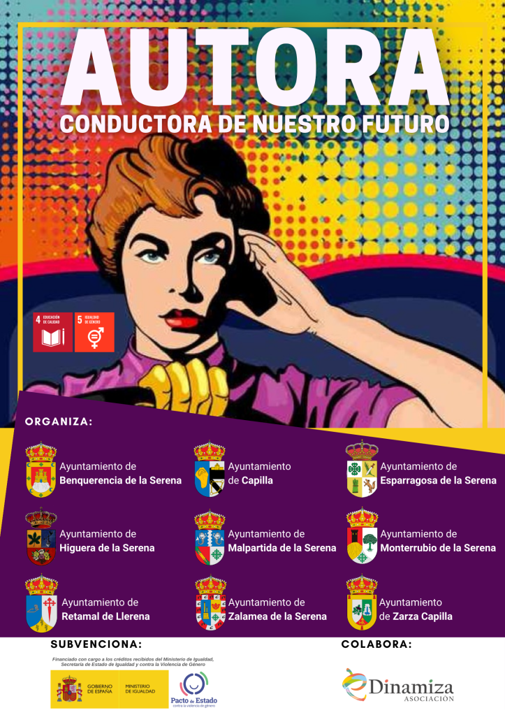 AUTORA, conductora de nuestro futuro. Desde eDinamiza hemos realizado el proyecto “AUTORAS, conductoras de nuestro futuro” (Pacto de Estado contra la Violencia de Género para el ejercicio 2021). Las localidades donde se ha realizado, durante el mes de marzo de 2022, han sido: Capilla, Zarza Capilla, Benquerencia de la Serena, La Nava, Helechal, Puerto Hurraco, Monterrubio de la Serena, Higuera de la Serena, Esparragosa de la Serena, Malpartida de la Serena, Zalamea de la Serena y Retamal de Llerena. Además, en el mes de junio, del mismo año, se sumó el municipio de Peraleda del Zaucejo.