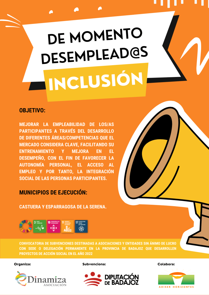 De Momento Desemplead@s Inclusión. Este proyecto se ha ejecutado durante los meses de septiembre a noviembre en Castuera, Esparragosa de la Serena, Zalamea de la Serena, así como con la Asociación de Minusválidos de Quintana de la Serena. Se ha realizado con la subvención de la Diputación de Badajoz destinada al desarrollo de proyectos de acción social en la provincia de Badajoz durante el año 2022.