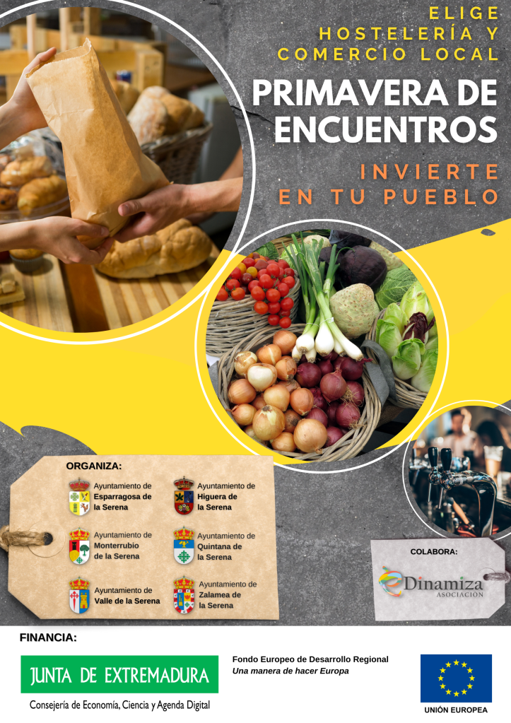 Primavera de Encuentros 2022. Proyecto de animación comercial organizado por los Ayuntamientos de Esparragosa de la Serena, Higuera de la Serena, Monterrubio de la Serena, Quintana de la Serena, Valle de la Serena y Zalamea de la Serena; ejecutado por la Asociación eDinamiza. Tiene como objetivo principal Promover procesos de promoción y dinamización comercial en los que, mediante la participación de la ciudadanía, se apoye al pequeño y mediano comercio y otros sectores económicos locales.