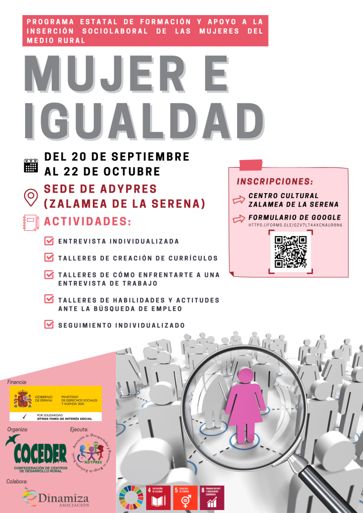 MUJERES E IGUALDAD. Este proyecto es un Programa Estatal de Formación y Apoyo a la Inserción Sociolaboral de las Mujeres del Medio Rural que financia el Ministerio de Derechos Sociales y Agenda 2030 y que ha sido desarrollado en la asociación ADYPRES de Zalamea de la Serena junto con la Asociación eDinamiza.