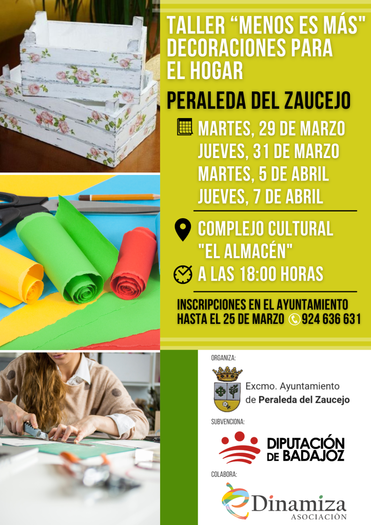 Taller “MENOS ES MÁS”. Decoraciones para el hogar. Este es un proyecto subvencionado por la Diputación de Badajoz y ejecutado por la Asociación eDinamiza durante el mes de marzo de 2022. El objetivo que perseguimos es reciclar o reutilizar aquellos objetos en desuso y darles una segunda vida, decorándolos a través de diferentes técnicas. Las participantes han sido las vecinas de Peraleda del Zaucejo.