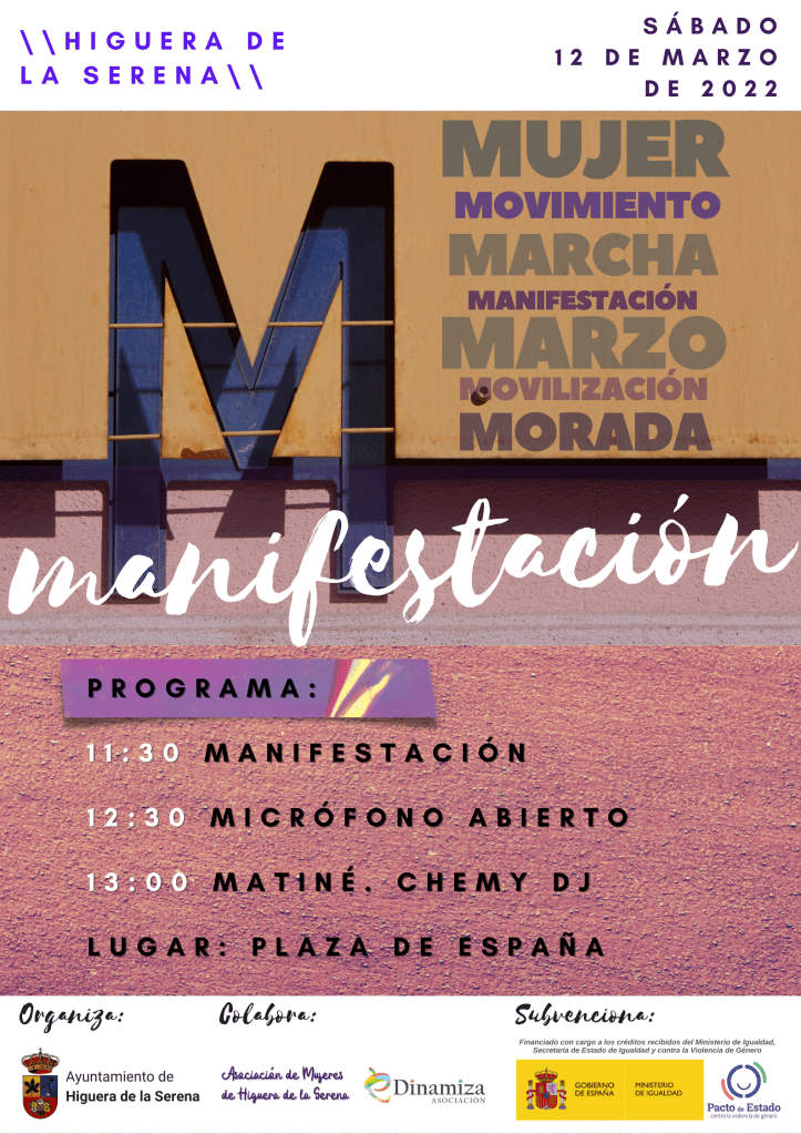 MANIFESTACIÓN DEL DIA INTERNACIONAL DE LA MUJER. Esta manifestación, organizada por el Ayuntamiento de Higuera de la Serena, con la colaboración de la Asociación de Mujeres de la localidad y del equipo eDinamiza, se ha celebrado el 12 de marzo de 2022 en Higuera de la Serena. El objetivo de la misma ha sido celebrar el Día Internacional de la Mujer y reivindicar la igualdad entre mujeres y hombres. Esta manifestación ha llevado como lema “Que el silencio no calle a las mujeres” y, a través de dinámicas, hemos conocido algunas de las demandas de las vecinas de nuestros pueblos: empleo, formación, participación, conciliación, mejores sueldos y pensiones, entre otros.
