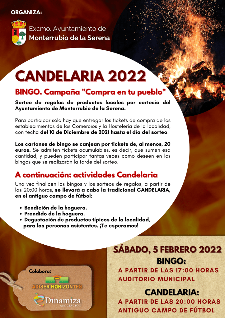 Campaña “COMPRA EN TU PUEBLO”. Este proyecto es una campaña de fomento de la hostelería y el comercio local, organizado por el Ayuntamiento de Monterrubio de la Serena, con la colaboración del equipo eDinamiza. Es un proyecto muy sencillo, en el que a través de los tickets de compra de los establecimientos locales se sortearon diferentes cestas con productos de las empresas locales. La campaña “Compra en tu pueblo” se ha realizado coincidiendo con la festividad de la Candelaria 2022 de Monterrubio de la Serena.