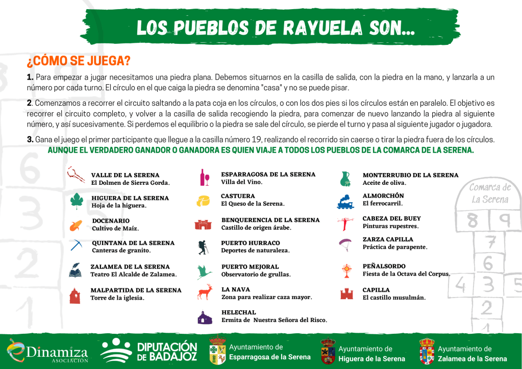 Con el objetivo de llegar a todos los públicos hemos adaptado el juego de la Rayuela en forma de Mapa de la Comarca de la Serena donde en cada una de las paradas represente a cada uno de los pueblos que la componen y esté representado con un icono que muestre alguna peculiaridad que los defina.