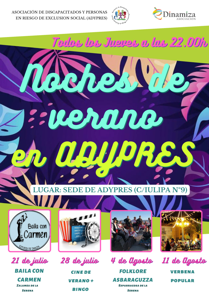 🙋♀️🙋♂️ Desde ADYPRES Zalamea y la Asociación eDinamiza volvemos este verano con el programa de dinamización «Noches de Verano en ADYPRES» en: