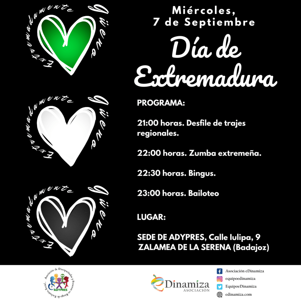 💚🤍🖤 Desde la Asociación eDinamiza y ADYPRES Zalamea os presentamos el cartel y la programación que hemos preparado para el Día de Extremadura, que celebraremos juntos el próximo miércoles 7 de septiembre.