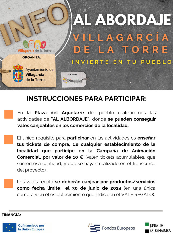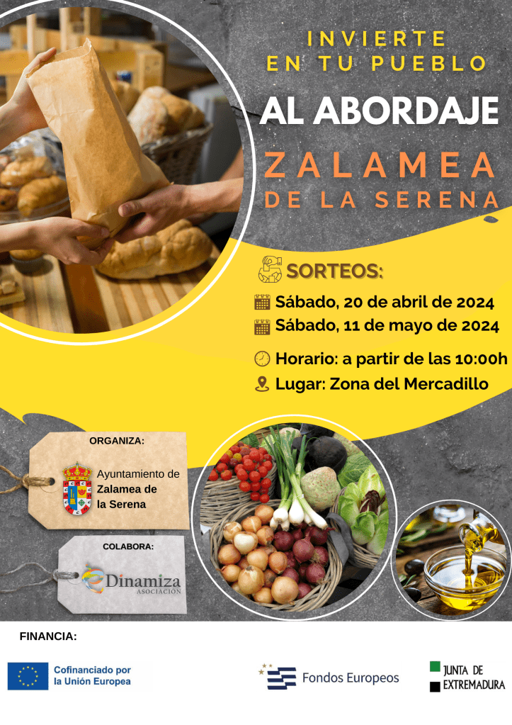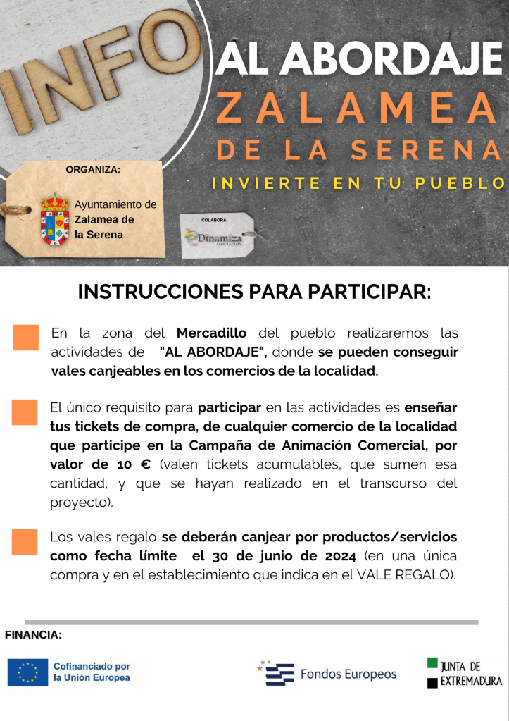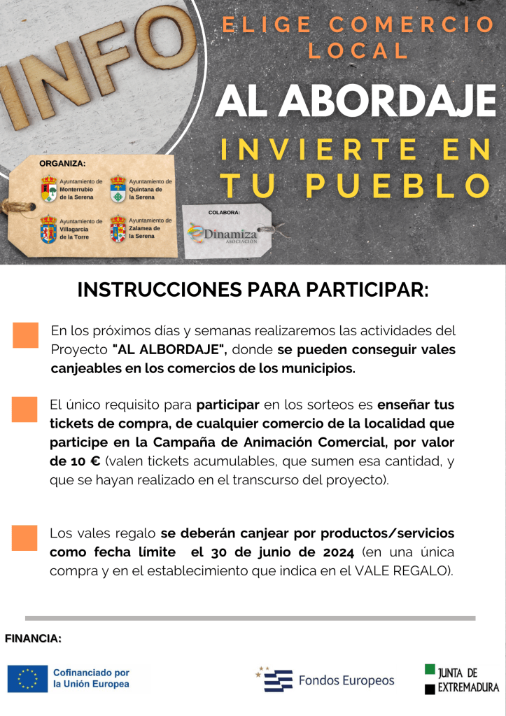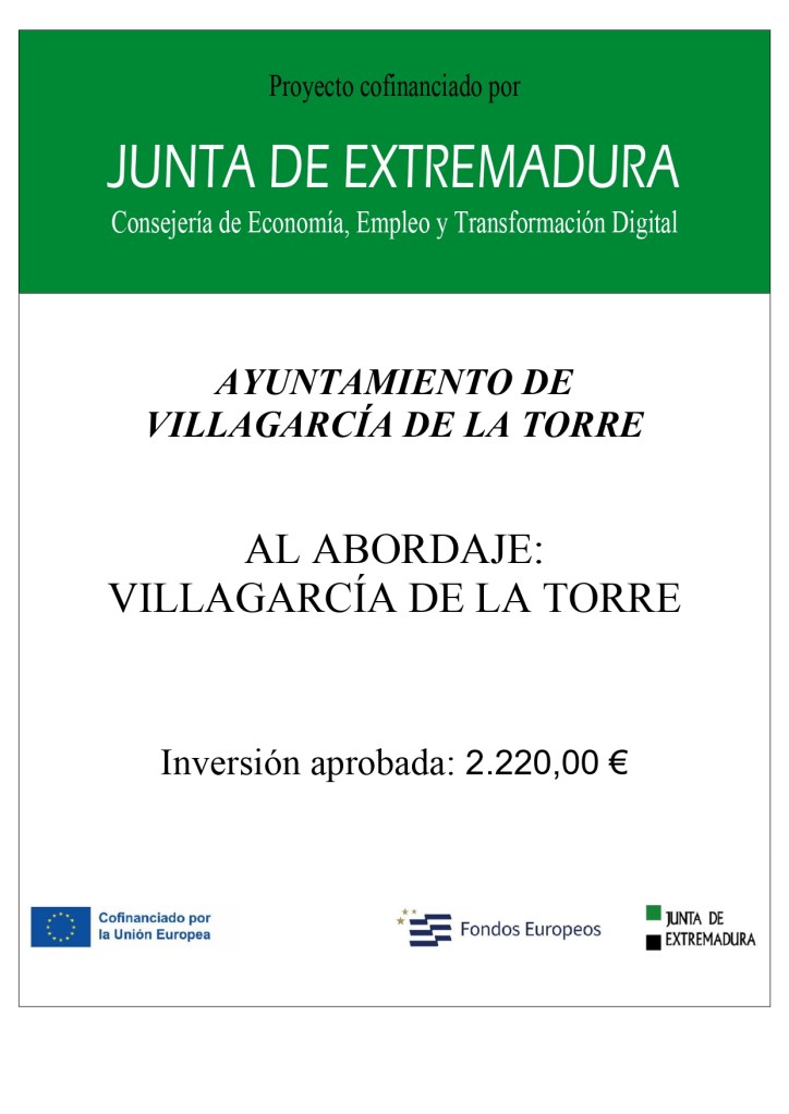 El proyecto “AL ABORDAJE” está organizado por los Ayuntamientos de Monterrubio de la Serena, Quintana de la Serena, Villagarcía de la Torre y Zalamea de la Serena, con la cofinanciación de la Junta de Extremadura (Consejería de Economía, Empleo y Transformación Digital) y la Unión Europea, encuadradas en el programa FEDER 2021-2027 Extremadura, a través del Fondo Europeo de Desarrollo Regional (FEDER), dentro del Objetivo Político 1: “Mejorar la competitividad de las PYME”, Prioridad de Inversión: 1.A “Transición Digital e Inteligente”, Objetivo específico 1 iii). “el refuerzo del crecimiento sostenible y la competitividad de las pymes y la creación de empleo en estas, también mediante inversiones productivas”.