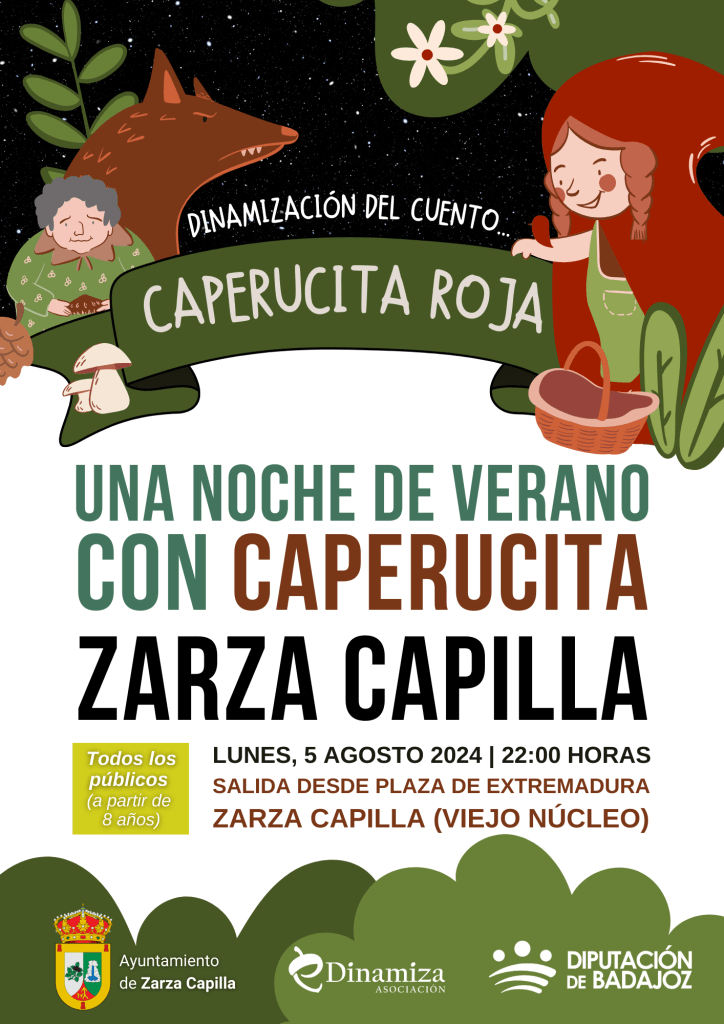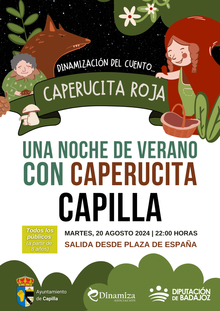 ✨ Este mes de agosto volvemos con la nueva actividad «Una Noche de Verano con Caperucita«, donde disfrutaremos de la dinamización del cuento de Caperucita, acompañados de algunos personajes y actividades en las calles de los pueblos: Zarza Capilla (5 de agosto) y Capilla (20 de agosto).