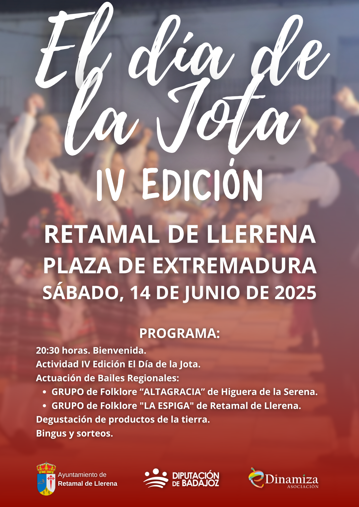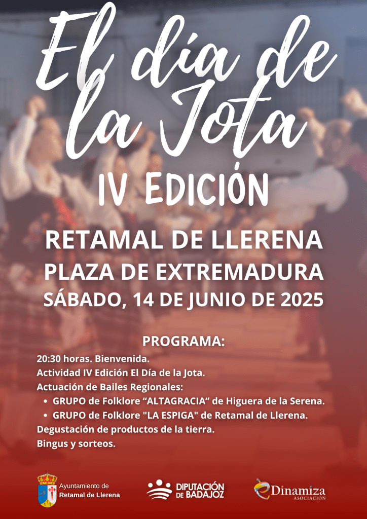 Desde el Ayuntamiento de Retamal de Llerena y la Asociación Edinamiza os presentamos el cartel de la nueva edición de «El Día de la Jota», que celebraremos juntos el sábado 14 de junio de 2025.