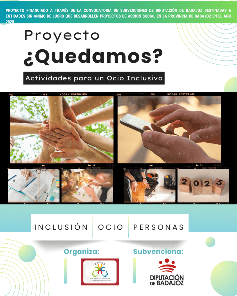 Entre las propuestas presentadas, Diputación de Badajoz seleccionó como beneficiario de la convocatoria a nuestro proyecto «JUERNES», presentado por la Asociación Edinamiza, y el proyecto «¿Quedamos? Actividades para un Ocio Inclusivo», presentado por la Asociación de Personas con Diversidad Funcional de Quintana de La Serena.