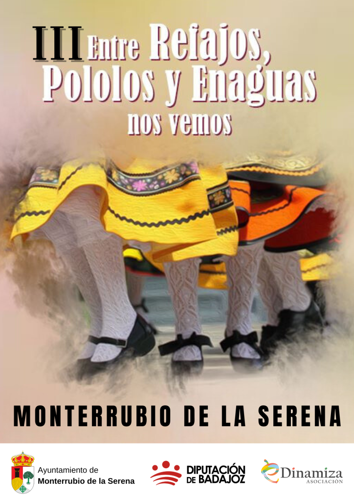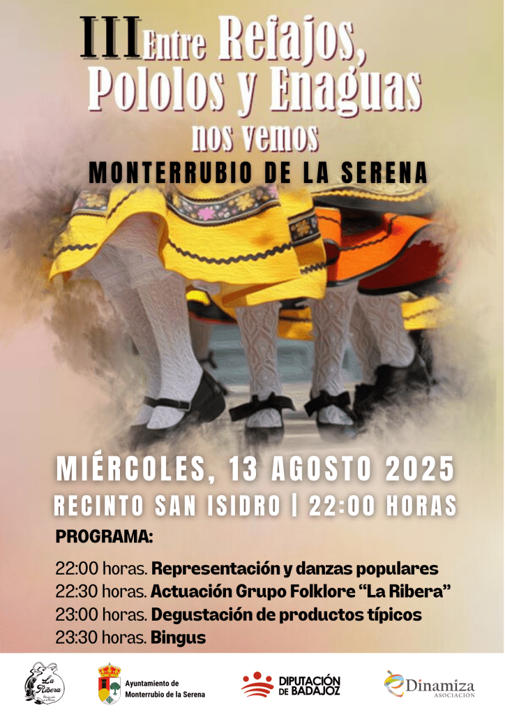 Desde el Ayuntamiento de Monterrubio de la Serena y la Asociación Edinamiza os presentamos el programa de la tercera edición de «Entre Refajos, Pololos y Enaguas nos vemos», que celebraremos juntos el próximo miércoles 13 de agosto de 2025, en el Recinto de San Isidro, con la colaboración especial del Grupo De Jota la Ribera.