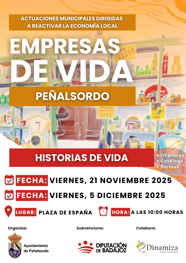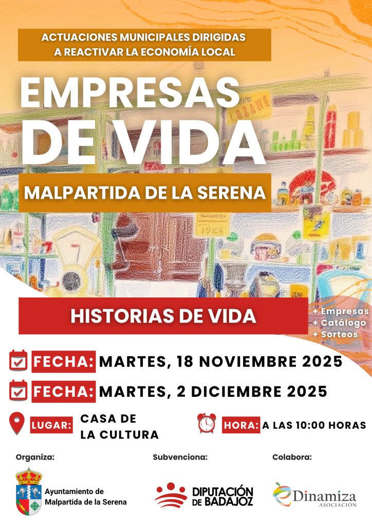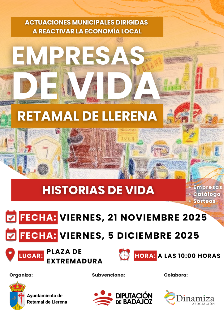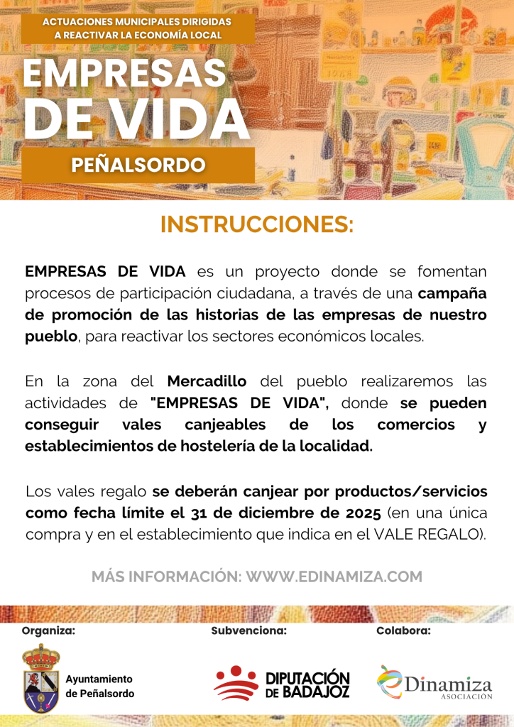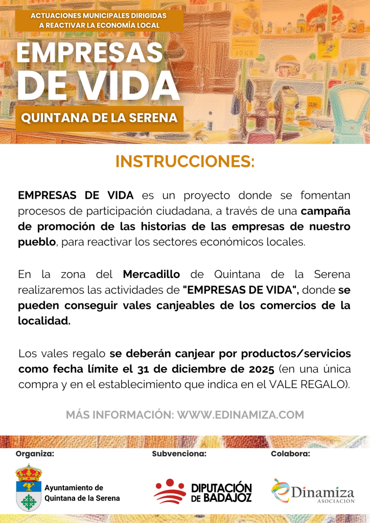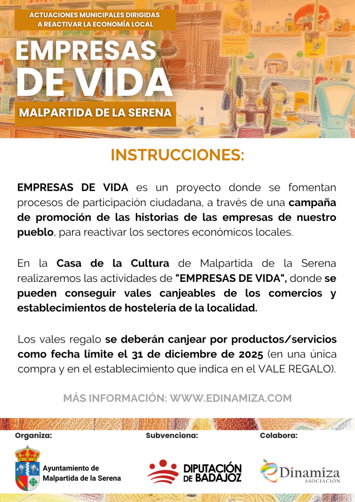 Comenzamos el nuevo proyecto EMPRESAS DE VIDA, financiado a través de la convocatoria de subvenciones de Diputación de Badajoz destinadas a ayuntamientos y entidades locales menores de la provincia de Badajoz para la realización de planes, proyectos o actuaciones municipales dirigidas a la reactivación de la economía local 2025.