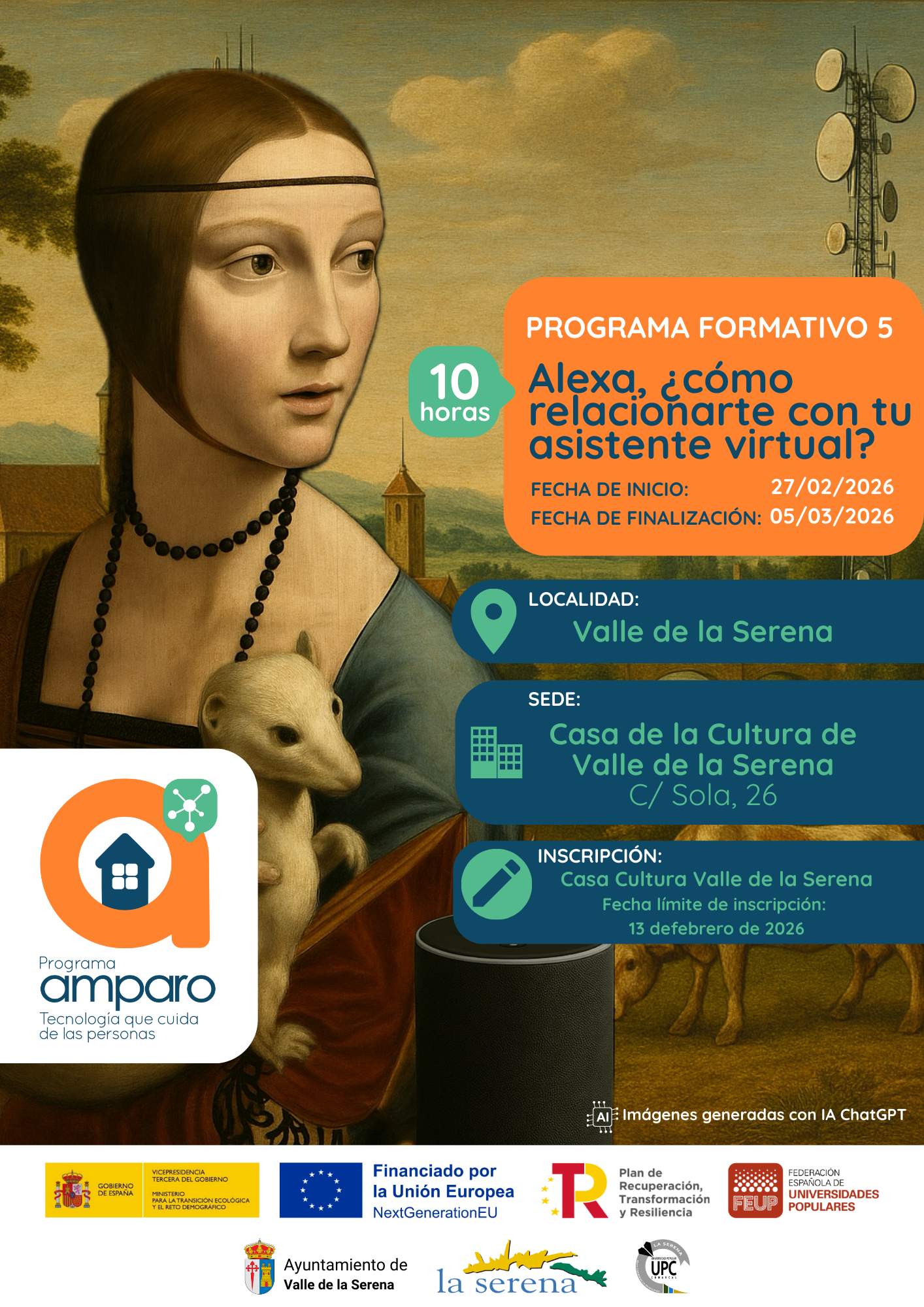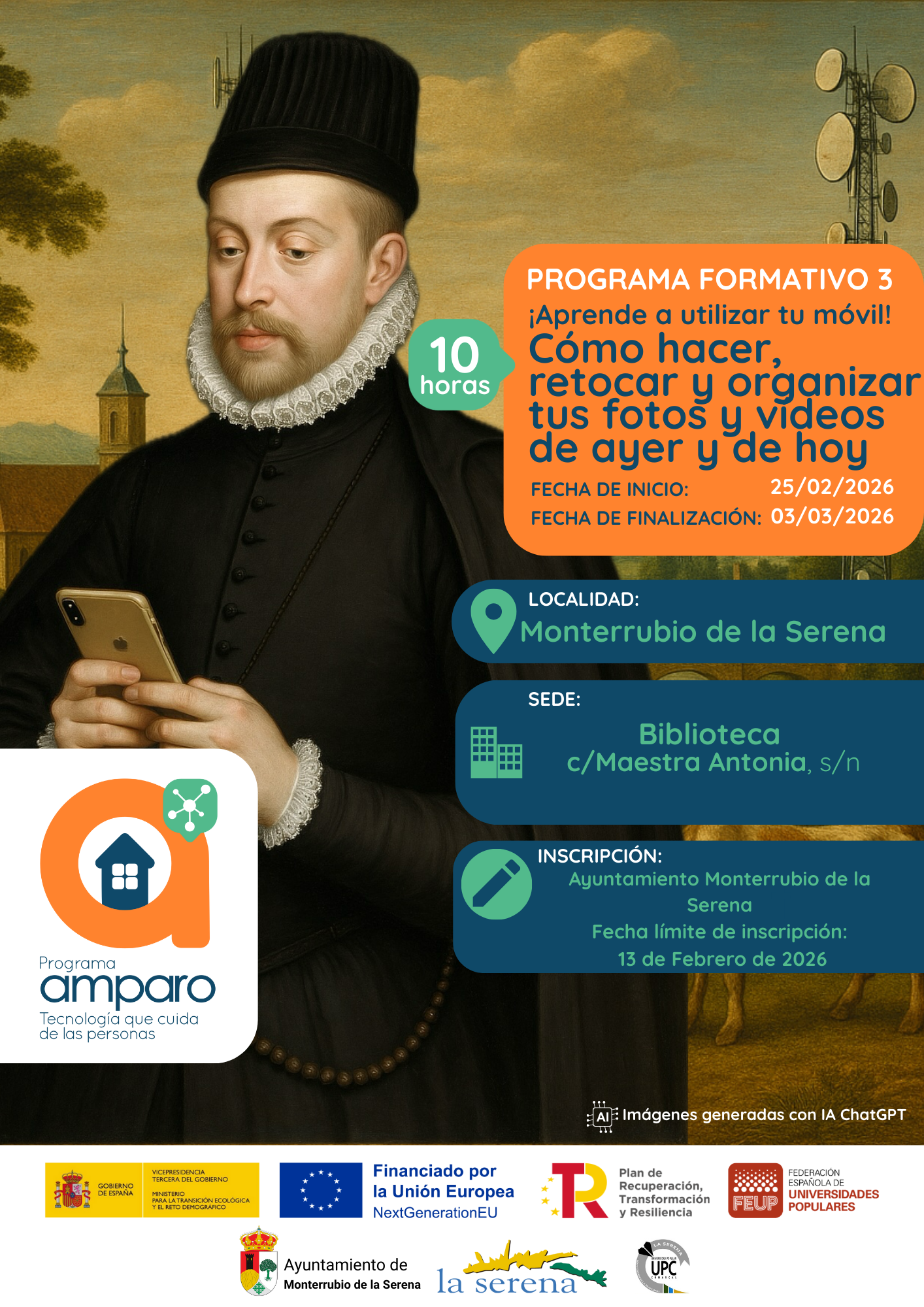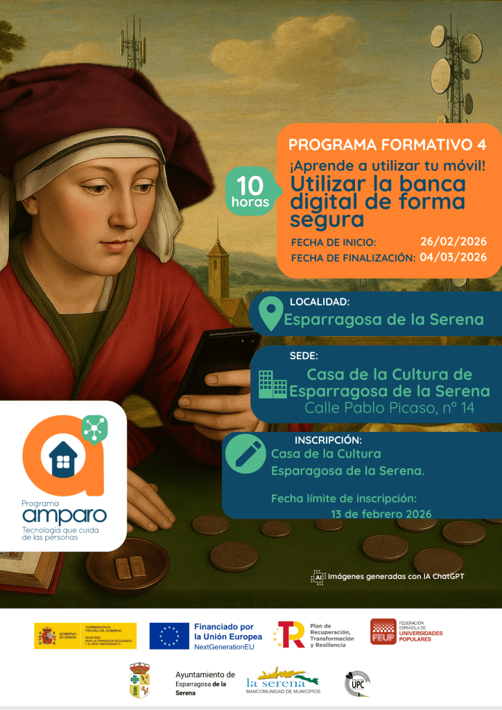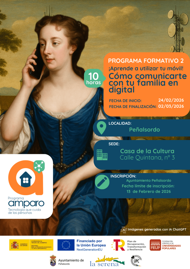 A partir del 2 de febrero de 2026, desde la Mancomunidad de Municipios de la Serena, con la colaboración de la Asociación Edinamiza, comenzamos la segunda edición del «Programa AMPARO: Tecnología que cuida de las personas», que promueve la Federación Española de Universidades Populares y está financiado por el Ministerio para la Transición Ecológica y el Reto Demográfico, en el marco del Programa Reto Rural Digital, incluido en el Plan de Recuperación, Transformación y Resiliencia, financiado por la Unión Europea – NextGenerationEU.